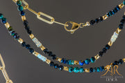 Diese Kette lässt sich besonders edel wie auf den letzten 2 Fotos mit der dunklen Variante kombinieren. Die schwarze Kette findest du unter folgendem Link: Link zur blauen Kette
